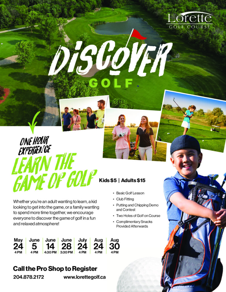 Ever wanted to learn the game of golf? Now's your chance! Join our Discover Golf at Lorette Golf Course Program, a one-house experience to get you into the game of golf.